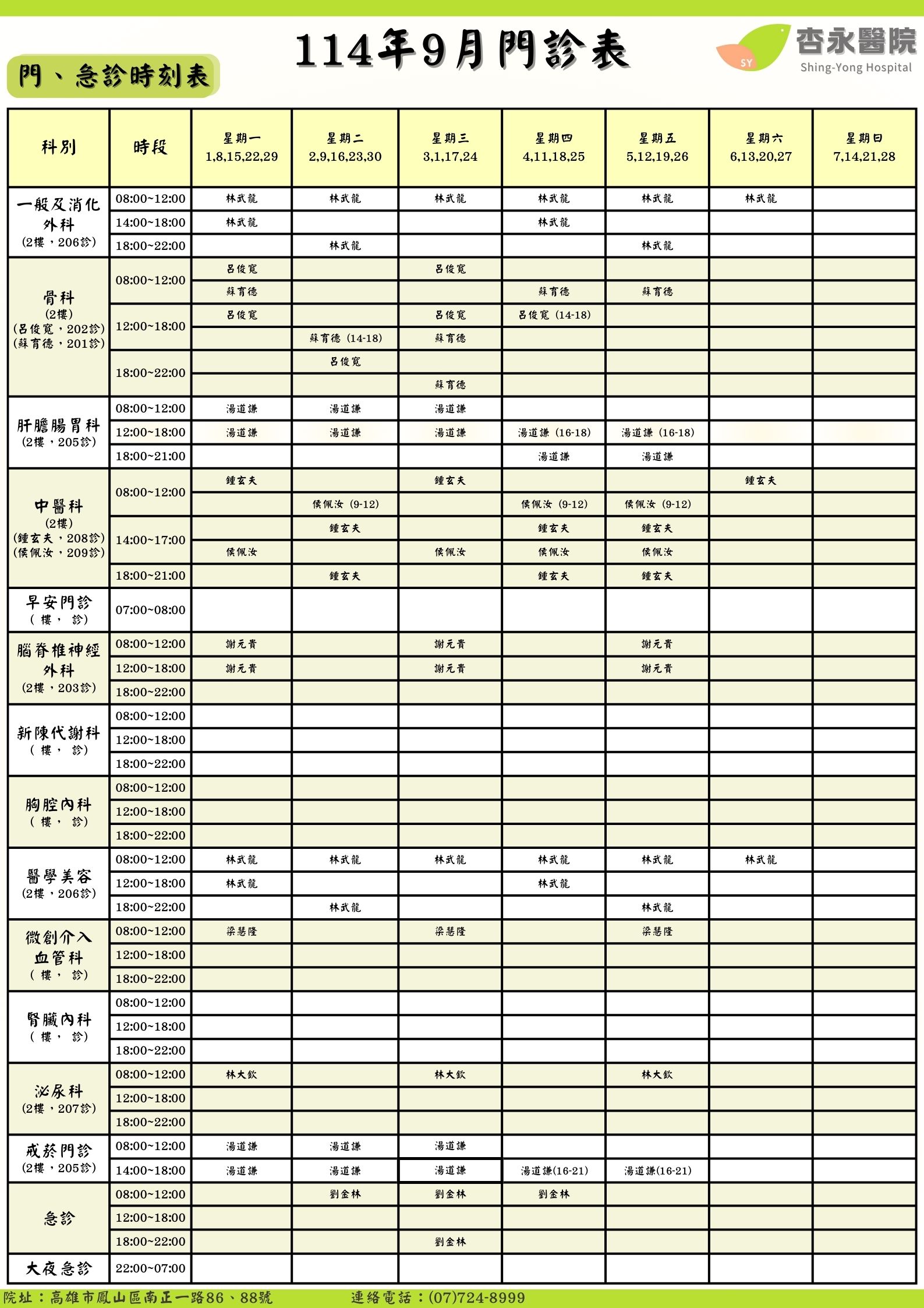 最新門診表9月
