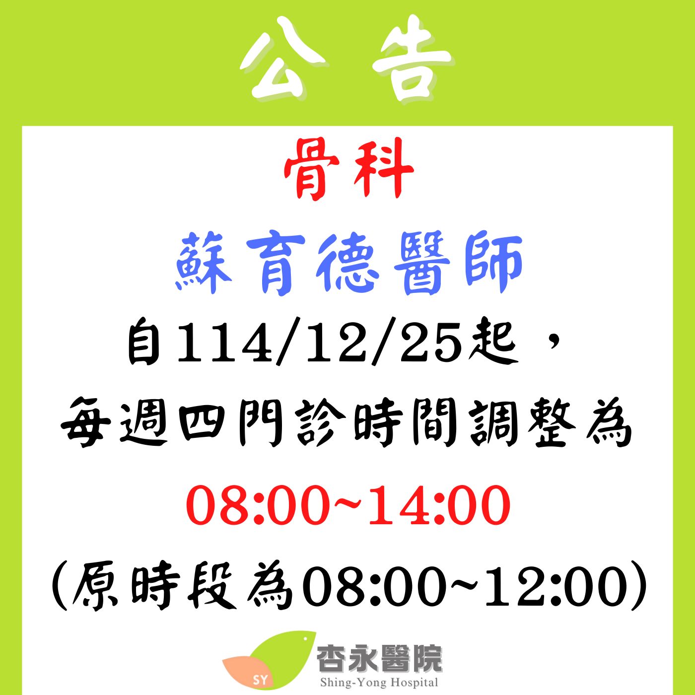 骨科 蘇育德醫師 門診時間異動