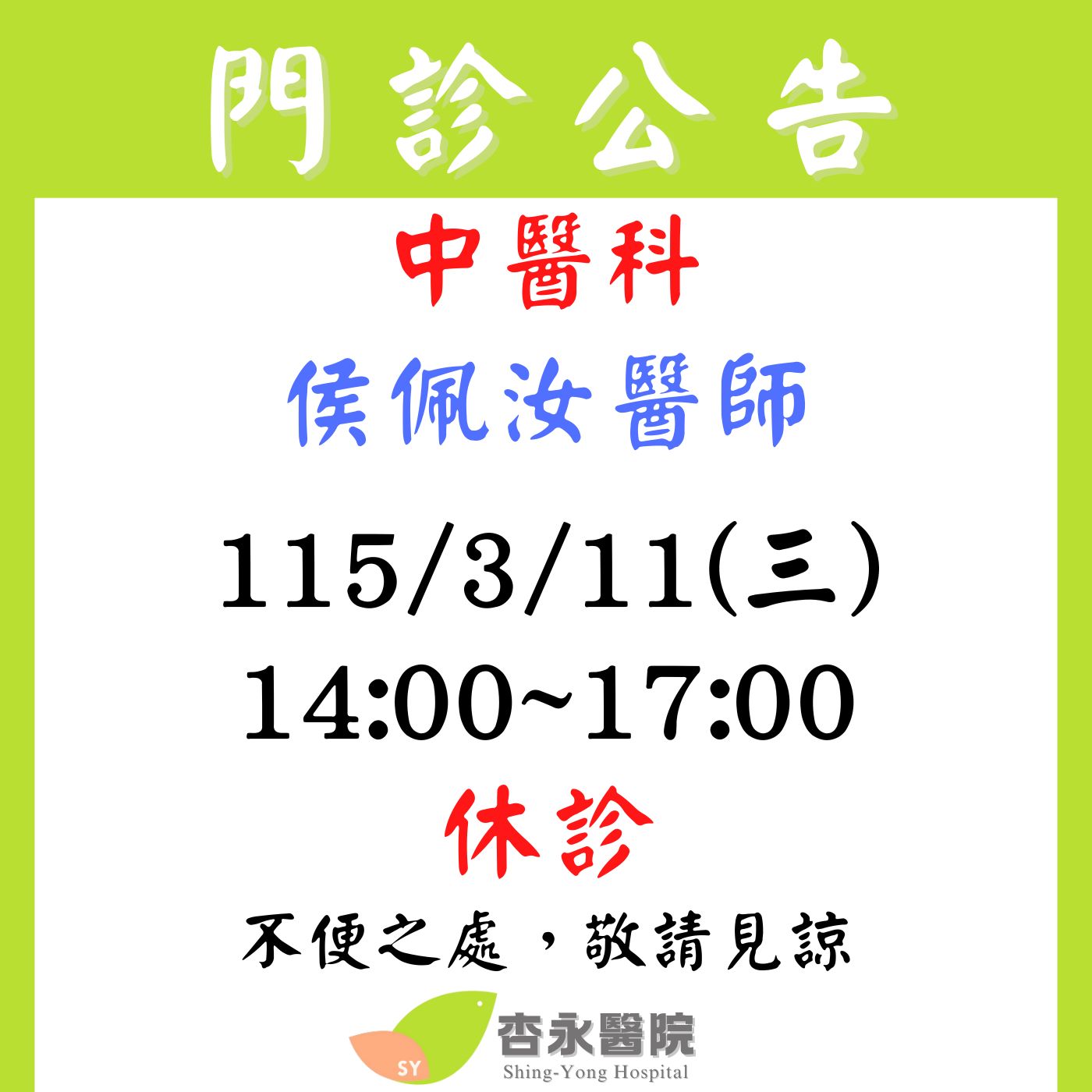115/3/11 中醫科 侯佩汝醫師 休診