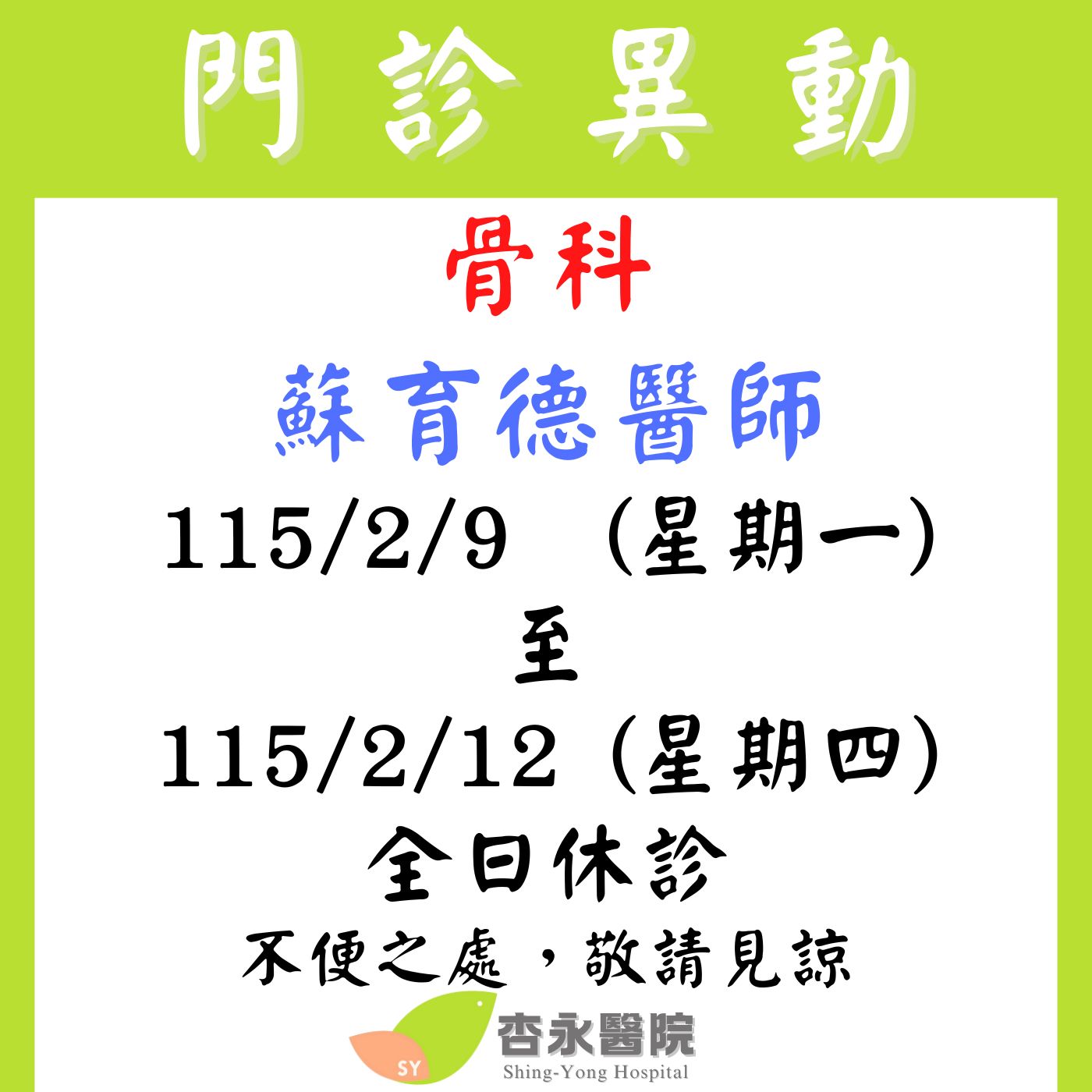 115/2/9~115/2/12 骨科 蘇育德醫師 休診